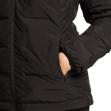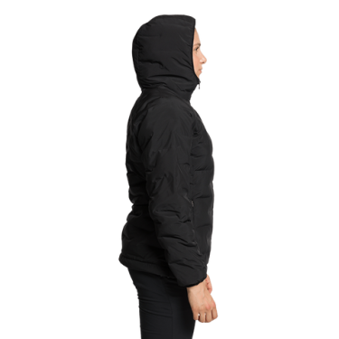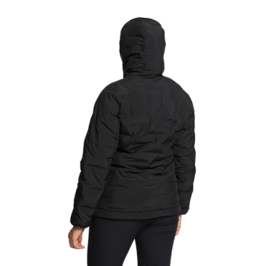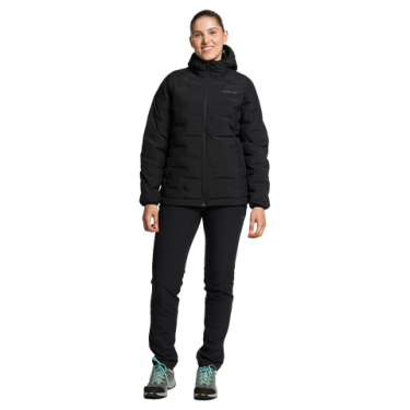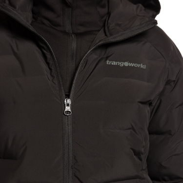 Chaqueta en poliéster downproof y Sorona®, cálida, suave y elástica. Con capucha fija, bolsillos con cremallera y acabado PFC-free. Ideal para montaña y uso diario.