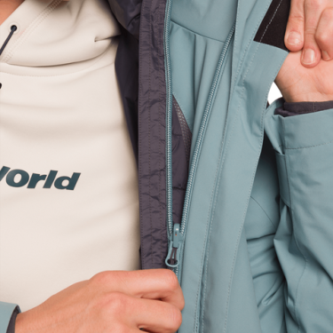 Jacket made from Inner Plus 2L with Fiberlite insulation (130 g). Features a detachable hood with zipper and dual adjusters for face and volume. Sealed seams and waterproof zippers. Waterproof and breathable membrane.