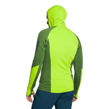 Elle dispose d’une capuche fixe avec contour élastique, d’une fermeture zippée frontale et d’un bas ajusté par élastique. Côté pratique : une poche poitrine à zip dissimulé, deux poches latérales et une poche zippée sur la manche.